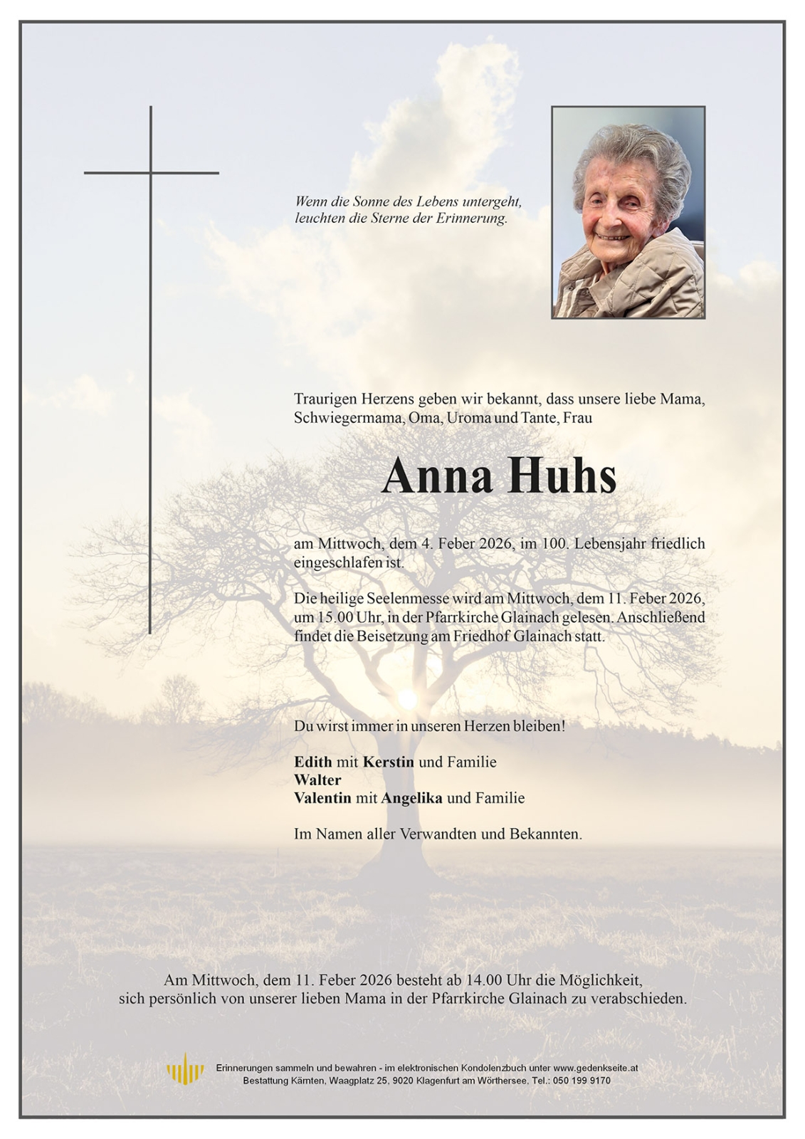 Verschicken Sie eine private Nachricht an die Familie & Hinterbliebenen von Anna Huhs. Diese wird nicht veröffentlicht, sondern landet direkt im E-Mail-Postfach der Administrator:innen dieser persönlichen Gedenkseite.