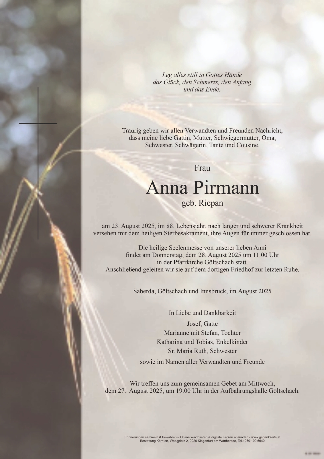 Verschicken Sie eine private Nachricht an die Familie & Hinterbliebenen von Anna Pirmann. Diese wird nicht veröffentlicht, sondern landet direkt im E-Mail-Postfach der Administrator:innen dieser persönlichen Gedenkseite.