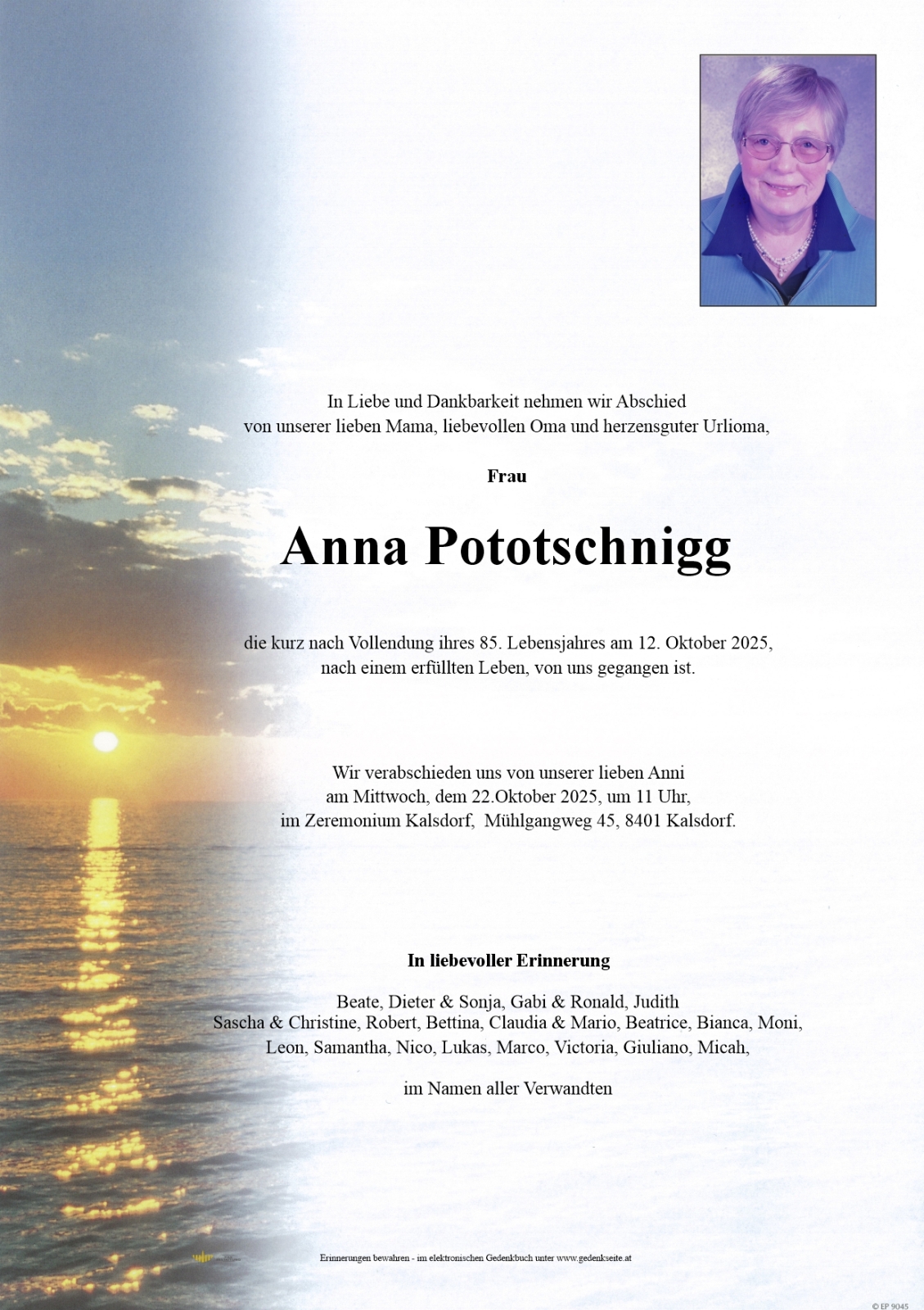 Verschicken Sie eine private Nachricht an die Familie & Hinterbliebenen von Anna Pototschnigg. Diese wird nicht veröffentlicht, sondern landet direkt im E-Mail-Postfach der Administrator:innen dieser persönlichen Gedenkseite.