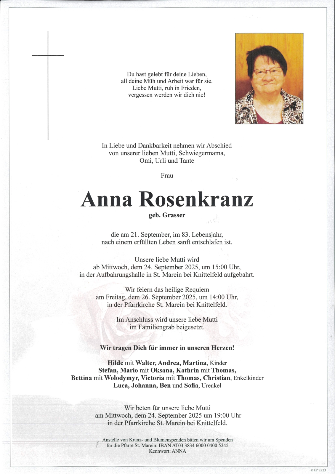 Verschicken Sie eine private Nachricht an die Familie & Hinterbliebenen von Anna Rosenkranz. Diese wird nicht veröffentlicht, sondern landet direkt im E-Mail-Postfach der Administrator:innen dieser persönlichen Gedenkseite.