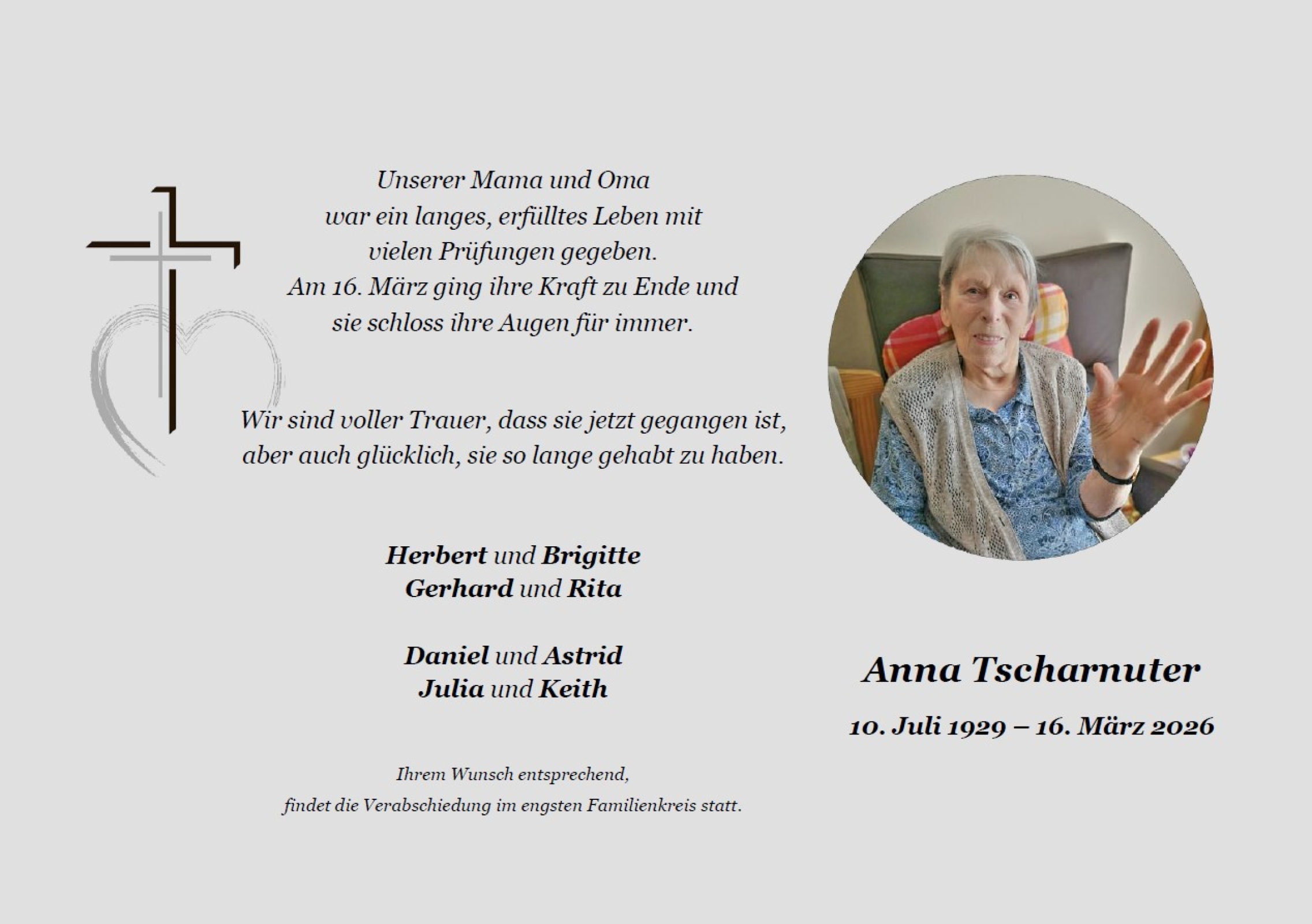 Verschicken Sie eine private Nachricht an die Familie & Hinterbliebenen von Anna Tscharnuter. Diese wird nicht veröffentlicht, sondern landet direkt im E-Mail-Postfach der Administrator:innen dieser persönlichen Gedenkseite.
