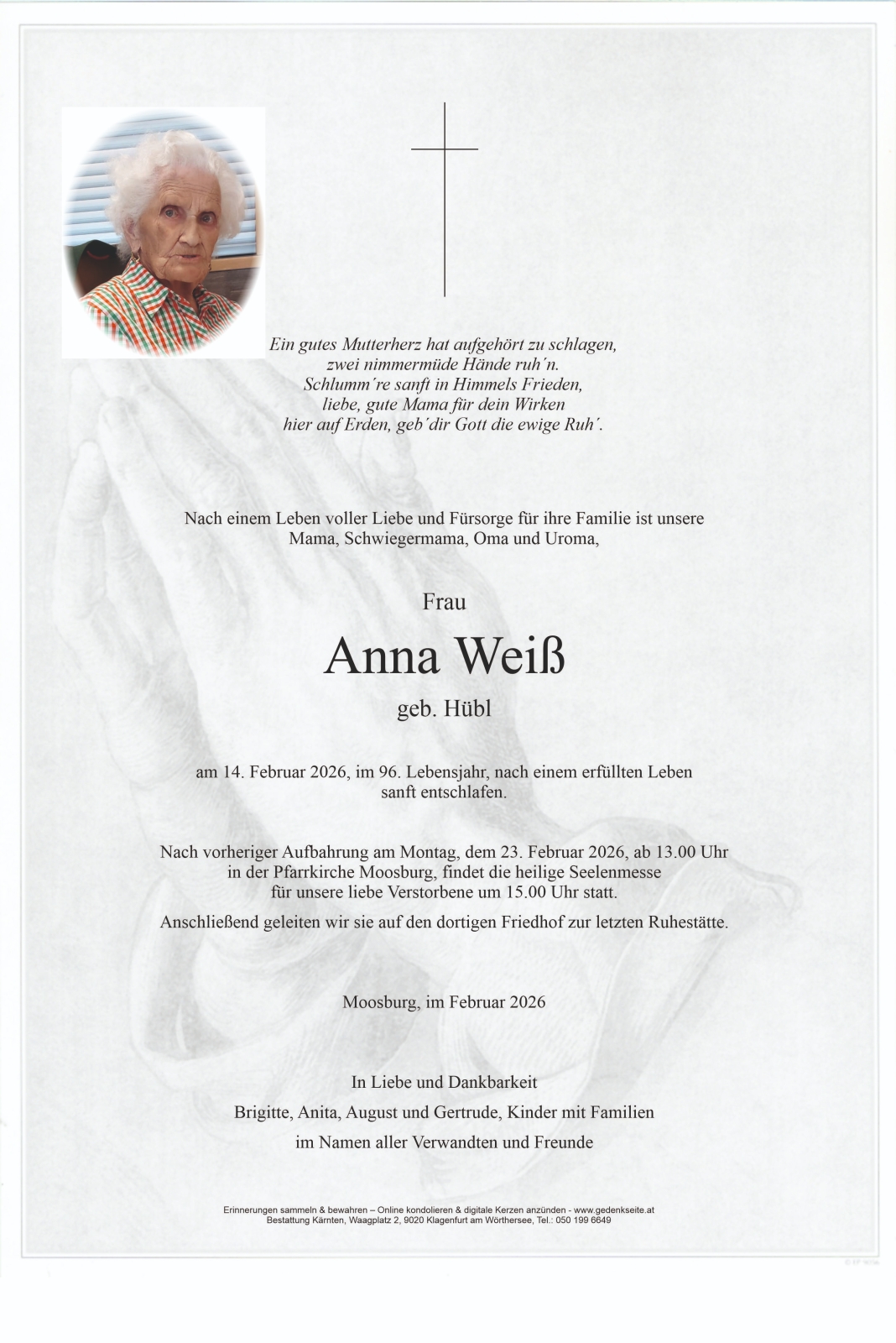 Verschicken Sie eine private Nachricht an die Familie & Hinterbliebenen von Anna Weiß. Diese wird nicht veröffentlicht, sondern landet direkt im E-Mail-Postfach der Administrator:innen dieser persönlichen Gedenkseite.
