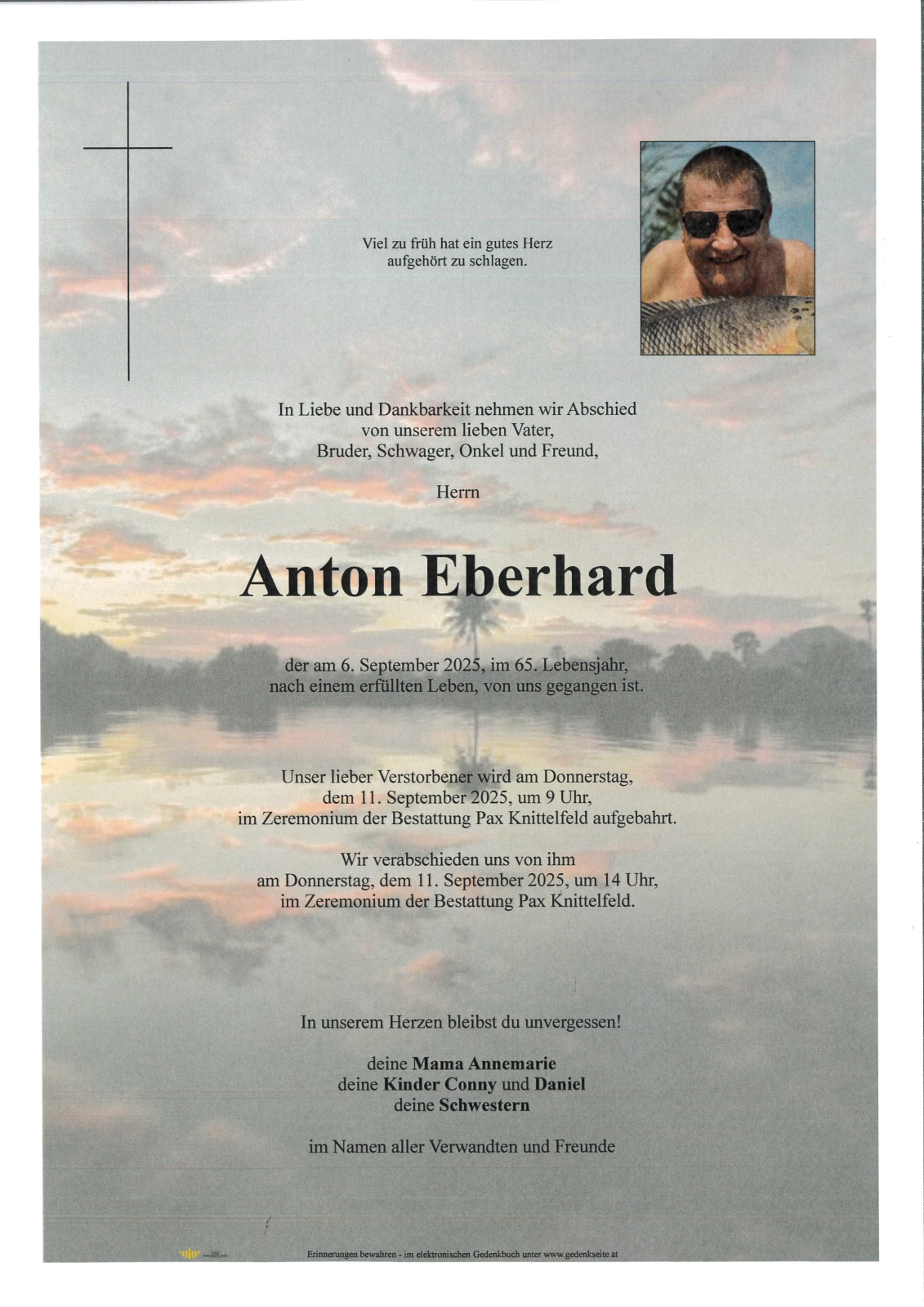 Verschicken Sie eine private Nachricht an die Familie & Hinterbliebenen von Anton Eberhard. Diese wird nicht veröffentlicht, sondern landet direkt im E-Mail-Postfach der Administrator:innen dieser persönlichen Gedenkseite.