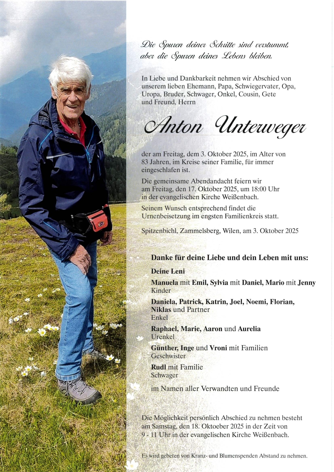 Verschicken Sie eine private Nachricht an die Familie & Hinterbliebenen von Anton Unterweger. Diese wird nicht veröffentlicht, sondern landet direkt im E-Mail-Postfach der Administrator:innen dieser persönlichen Gedenkseite.