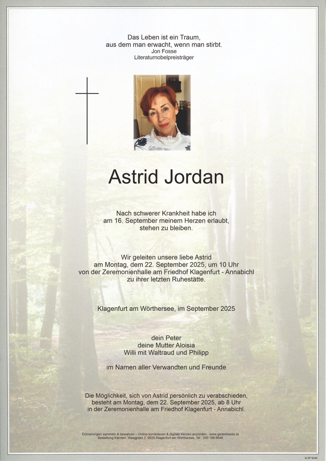 Verschicken Sie eine private Nachricht an die Familie & Hinterbliebenen von Astrid Jordan. Diese wird nicht veröffentlicht, sondern landet direkt im E-Mail-Postfach der Administrator:innen dieser persönlichen Gedenkseite.