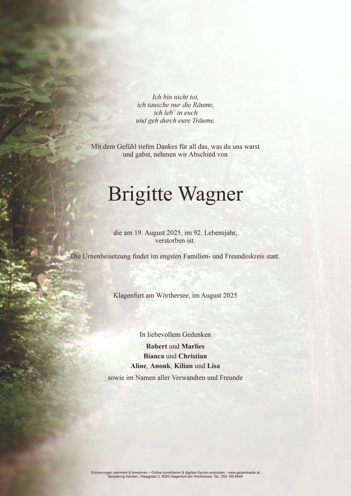 Verschicken Sie eine private Nachricht an die Familie & Hinterbliebenen von Brigitte Wagner. Diese wird nicht veröffentlicht, sondern landet direkt im E-Mail-Postfach der Administrator:innen dieser persönlichen Gedenkseite.