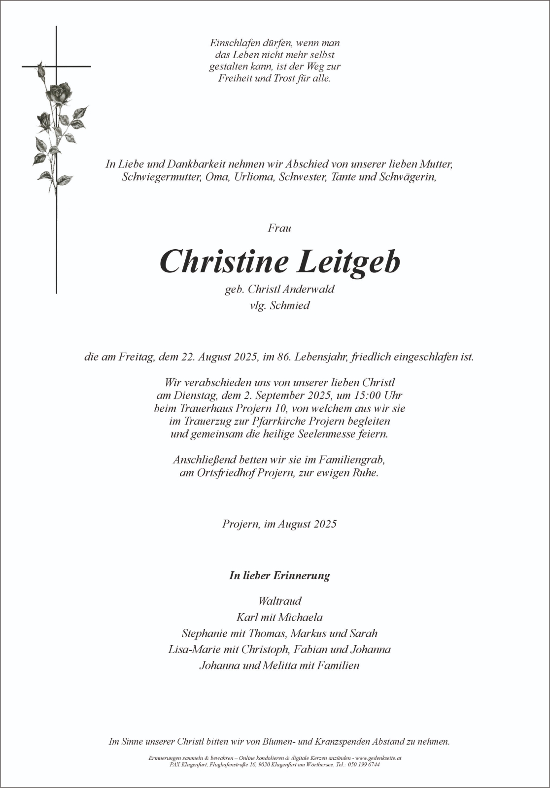 Verschicken Sie eine private Nachricht an die Familie & Hinterbliebenen von Christine Leitgeb. Diese wird nicht veröffentlicht, sondern landet direkt im E-Mail-Postfach der Administrator:innen dieser persönlichen Gedenkseite.