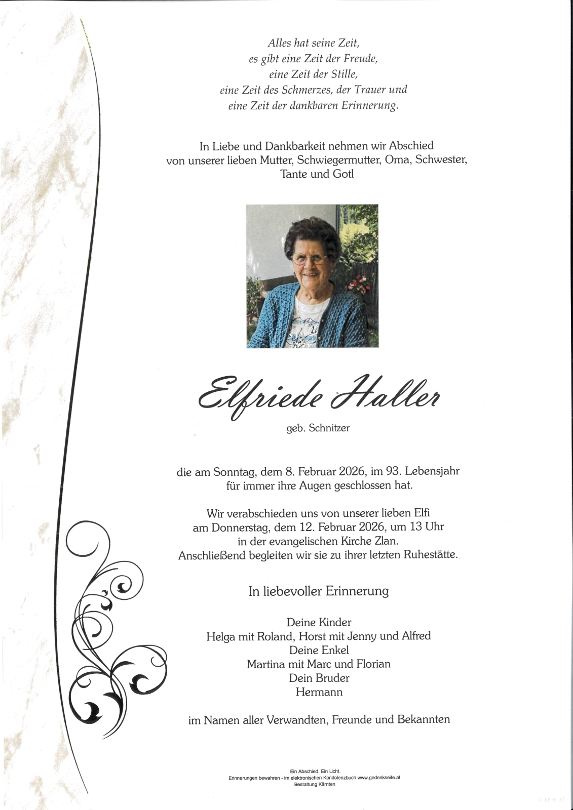 Verschicken Sie eine private Nachricht an die Familie & Hinterbliebenen von Elfriede Haller. Diese wird nicht veröffentlicht, sondern landet direkt im E-Mail-Postfach der Administrator:innen dieser persönlichen Gedenkseite.