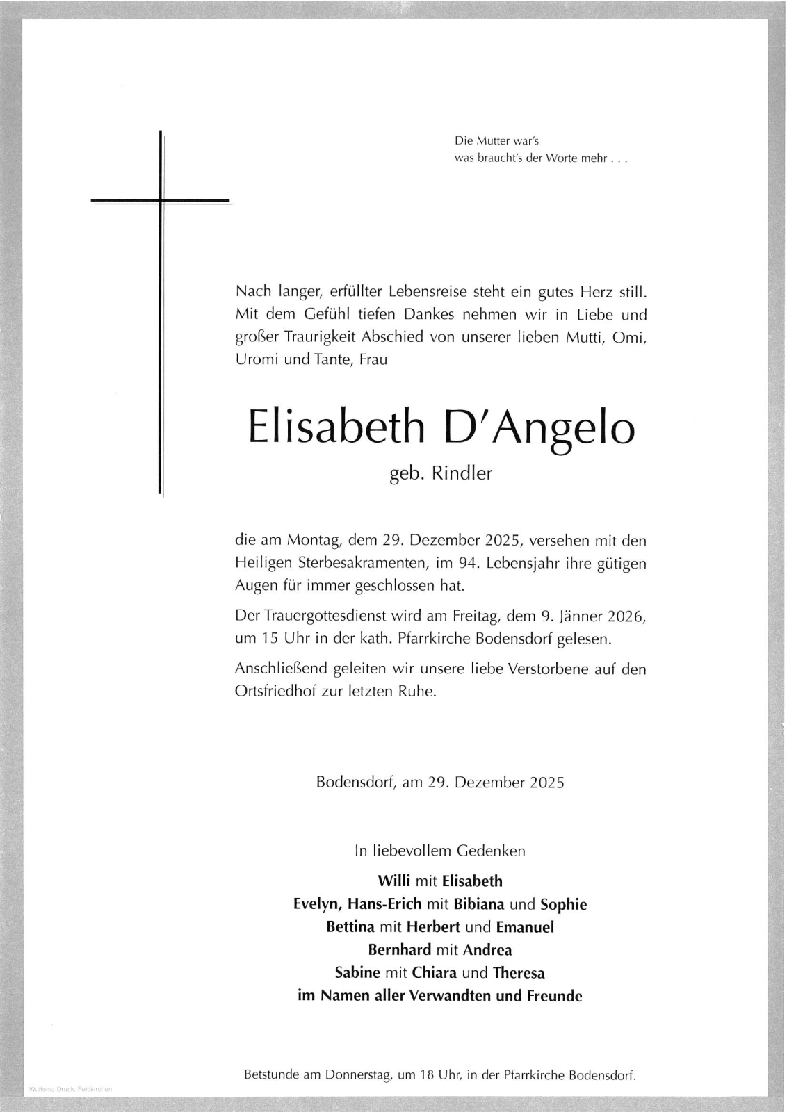 Trauerfeier am 9. Jänner 2026 um 15:00 Uhr,