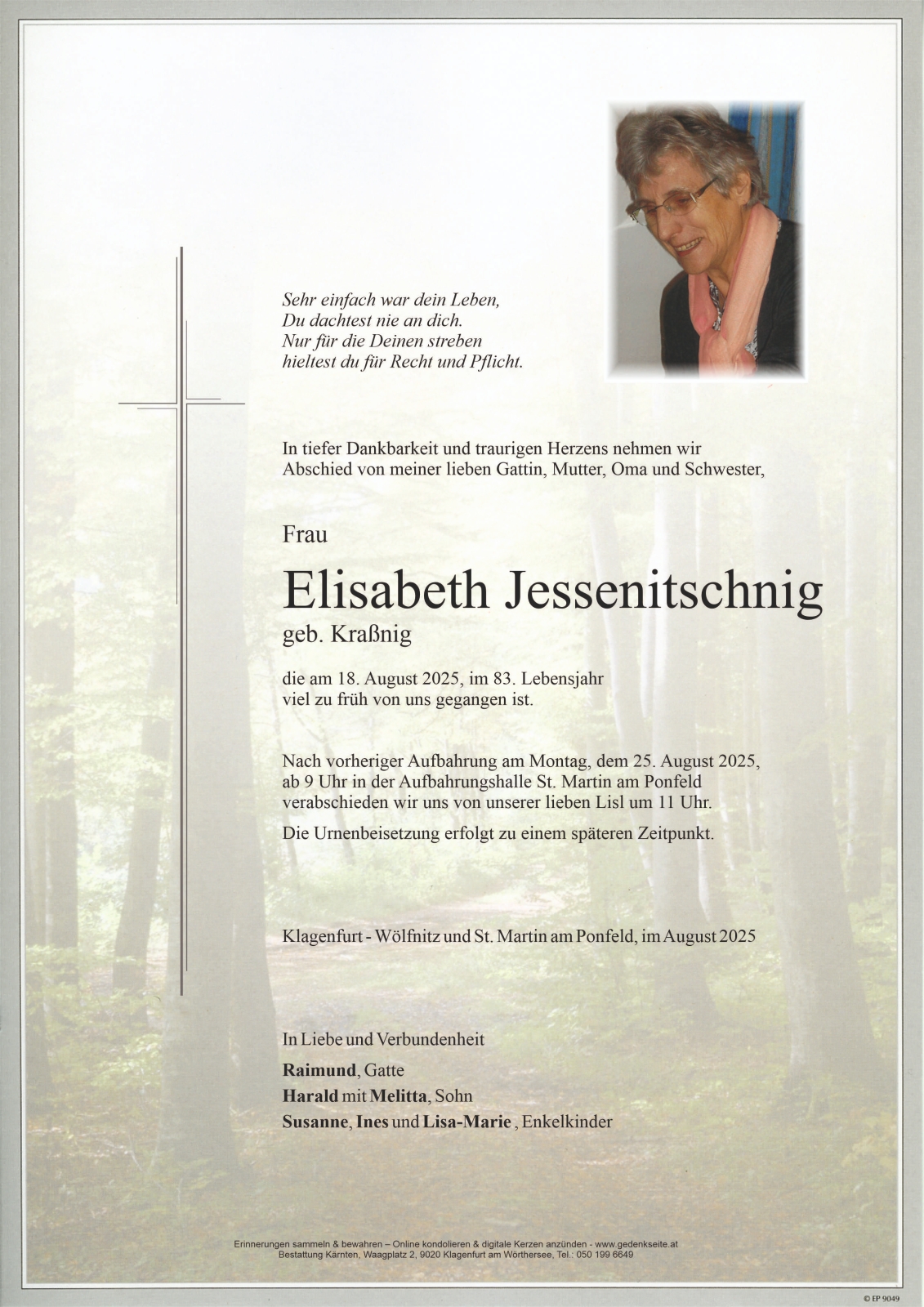 Verschicken Sie eine private Nachricht an die Familie & Hinterbliebenen von Elisabeth Jessenitschnig. Diese wird nicht veröffentlicht, sondern landet direkt im E-Mail-Postfach der Administrator:innen dieser persönlichen Gedenkseite.