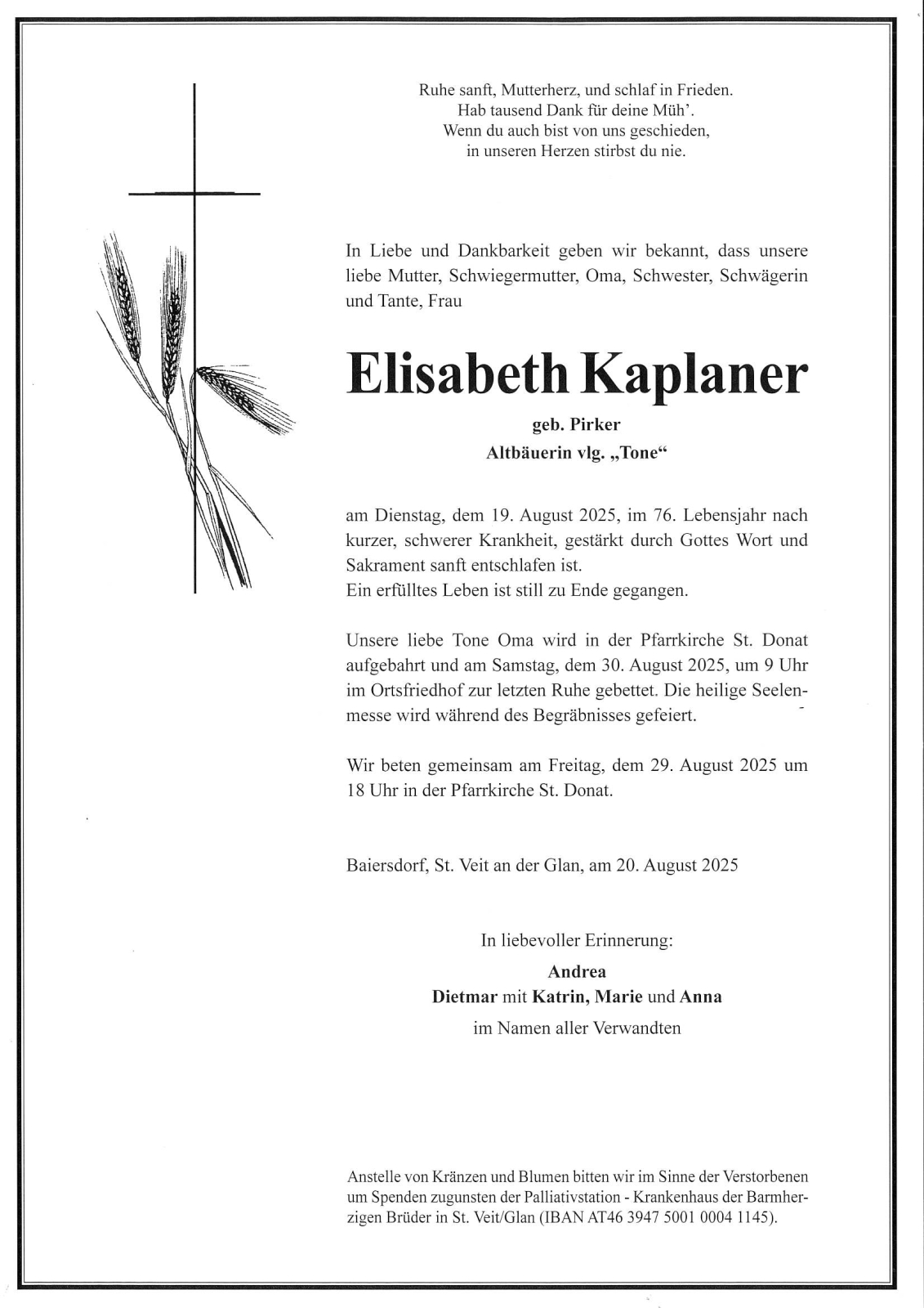 Verschicken Sie eine private Nachricht an die Familie & Hinterbliebenen von Elisabeth Kaplaner. Diese wird nicht veröffentlicht, sondern landet direkt im E-Mail-Postfach der Administrator:innen dieser persönlichen Gedenkseite.