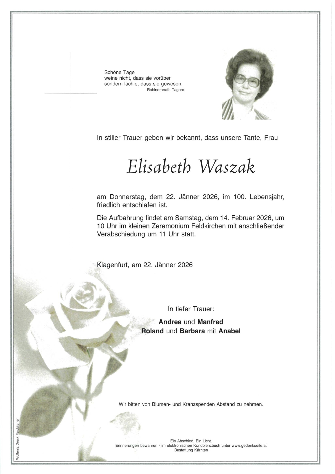 Verschicken Sie eine private Nachricht an die Familie & Hinterbliebenen von Elisabeth Waszak. Diese wird nicht veröffentlicht, sondern landet direkt im E-Mail-Postfach der Administrator:innen dieser persönlichen Gedenkseite.
