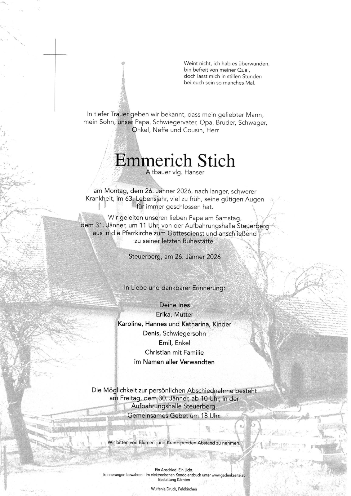Verschicken Sie eine private Nachricht an die Familie & Hinterbliebenen von Emmerich Stich. Diese wird nicht veröffentlicht, sondern landet direkt im E-Mail-Postfach der Administrator:innen dieser persönlichen Gedenkseite.