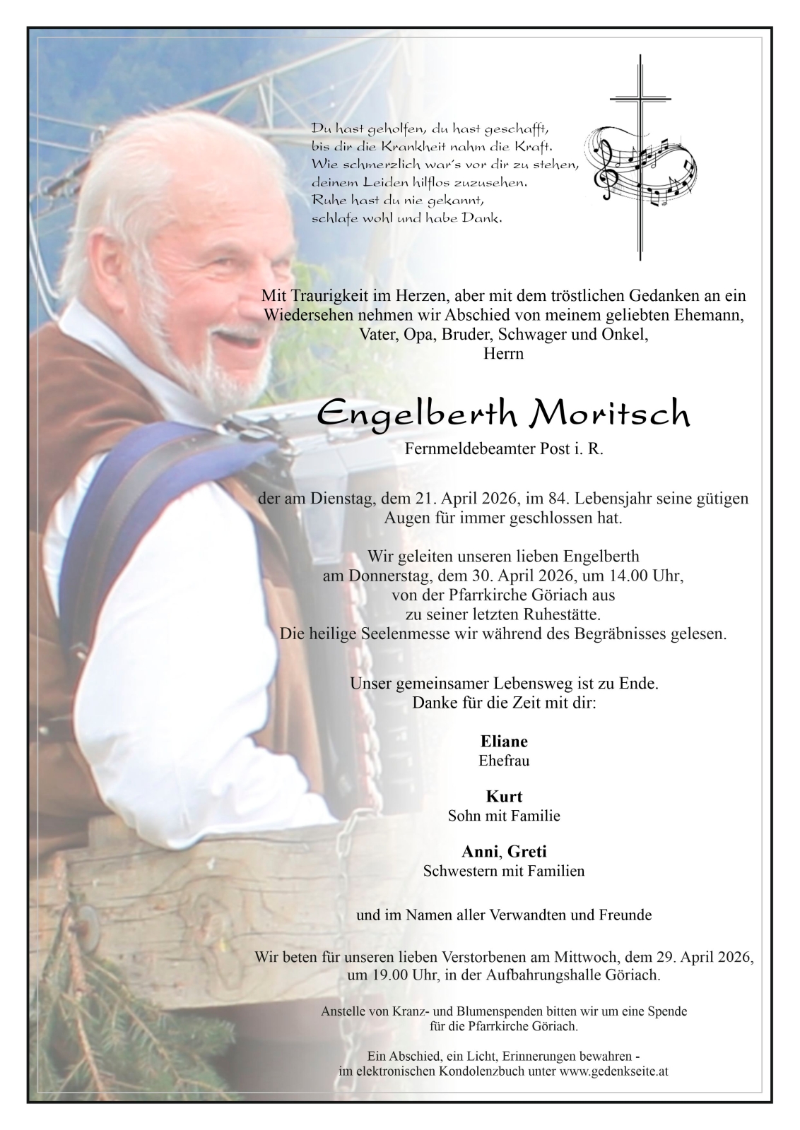 Verschicken Sie eine private Nachricht an die Familie & Hinterbliebenen von Engelberth Moritsch. Diese wird nicht veröffentlicht, sondern landet direkt im E-Mail-Postfach der Administrator:innen dieser persönlichen Gedenkseite.