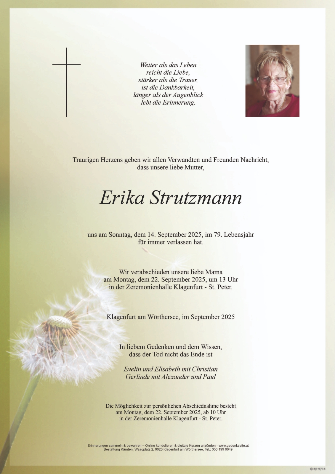 Verschicken Sie eine private Nachricht an die Familie & Hinterbliebenen von Erika Strutzmann. Diese wird nicht veröffentlicht, sondern landet direkt im E-Mail-Postfach der Administrator:innen dieser persönlichen Gedenkseite.