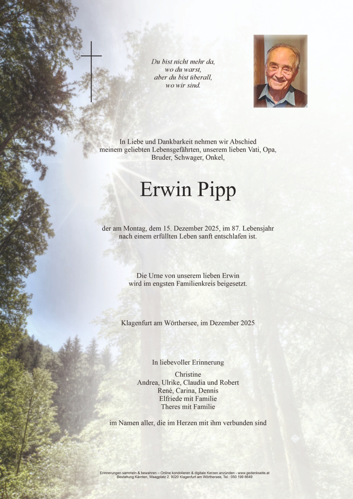 Verschicken Sie eine private Nachricht an die Familie & Hinterbliebenen von Erwin Pipp. Diese wird nicht veröffentlicht, sondern landet direkt im E-Mail-Postfach der Administrator:innen dieser persönlichen Gedenkseite.