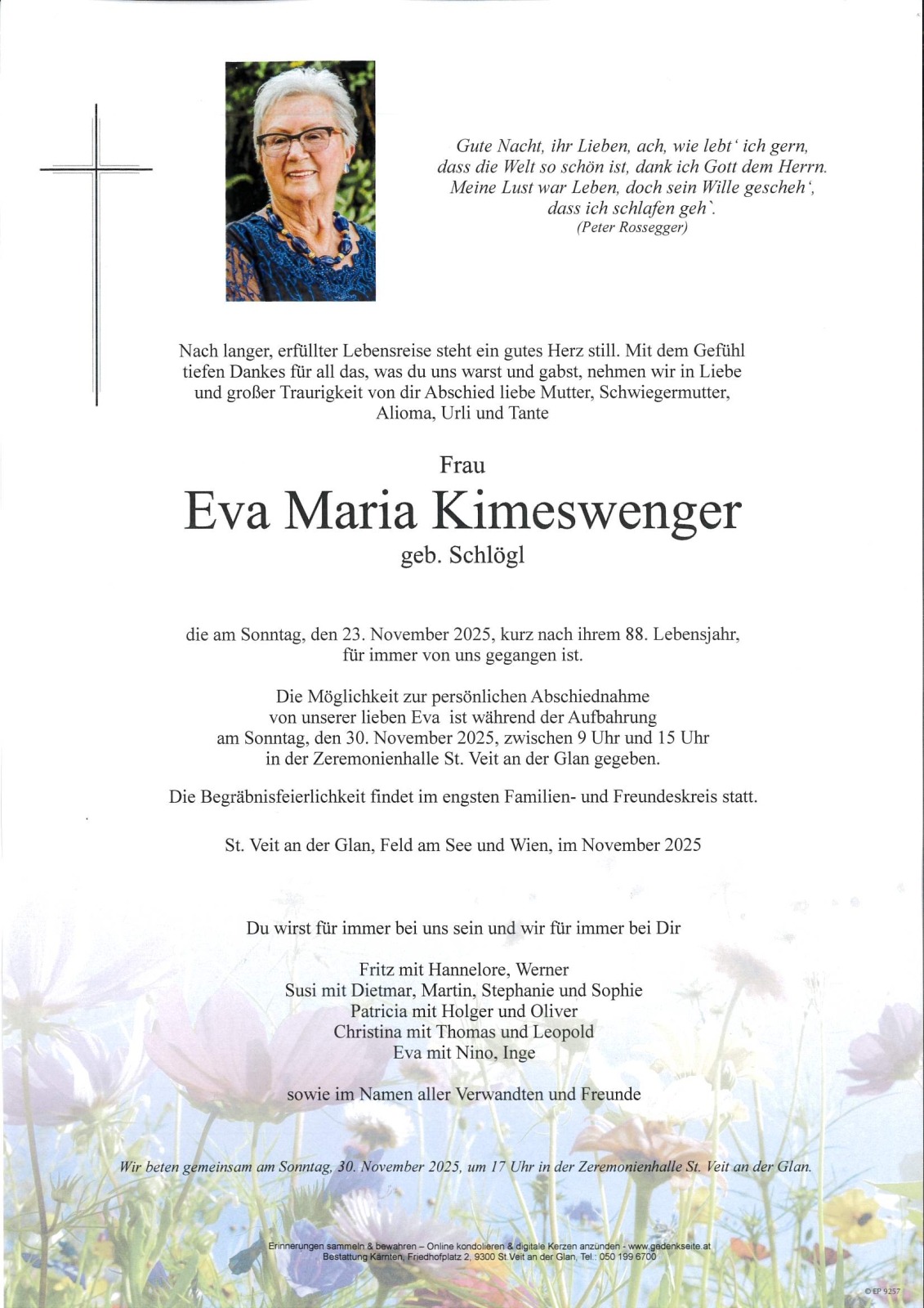 Verschicken Sie eine private Nachricht an die Familie & Hinterbliebenen von Eva Maria Kimeswenger. Diese wird nicht veröffentlicht, sondern landet direkt im E-Mail-Postfach der Administrator:innen dieser persönlichen Gedenkseite.