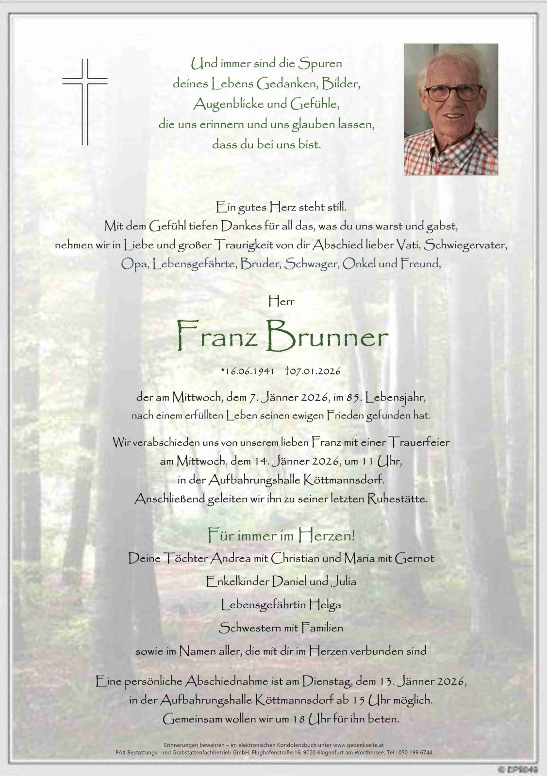 Verschicken Sie eine private Nachricht an die Familie & Hinterbliebenen von Franz Brunner. Diese wird nicht veröffentlicht, sondern landet direkt im E-Mail-Postfach der Administrator:innen dieser persönlichen Gedenkseite.