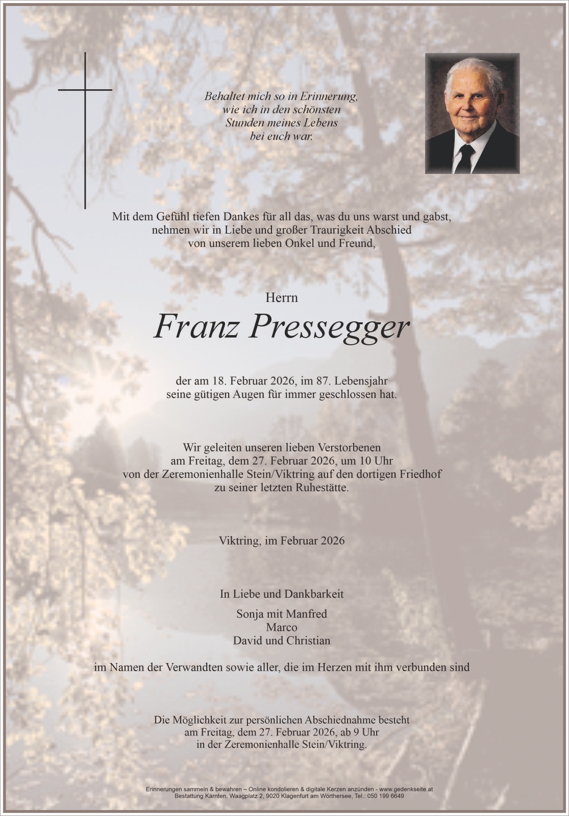 Verschicken Sie eine private Nachricht an die Familie & Hinterbliebenen von Franz Pressegger. Diese wird nicht veröffentlicht, sondern landet direkt im E-Mail-Postfach der Administrator:innen dieser persönlichen Gedenkseite.