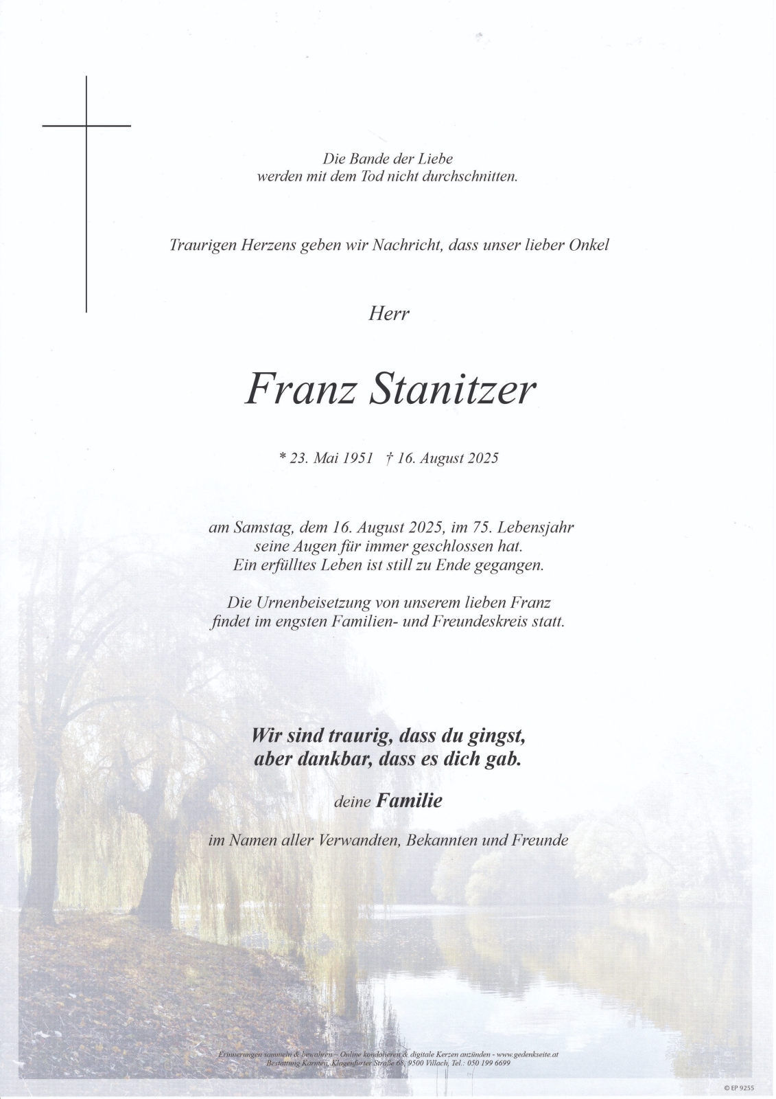 Verschicken Sie eine private Nachricht an die Familie & Hinterbliebenen von Franz Stanitzer. Diese wird nicht veröffentlicht, sondern landet direkt im E-Mail-Postfach der Administrator:innen dieser persönlichen Gedenkseite.