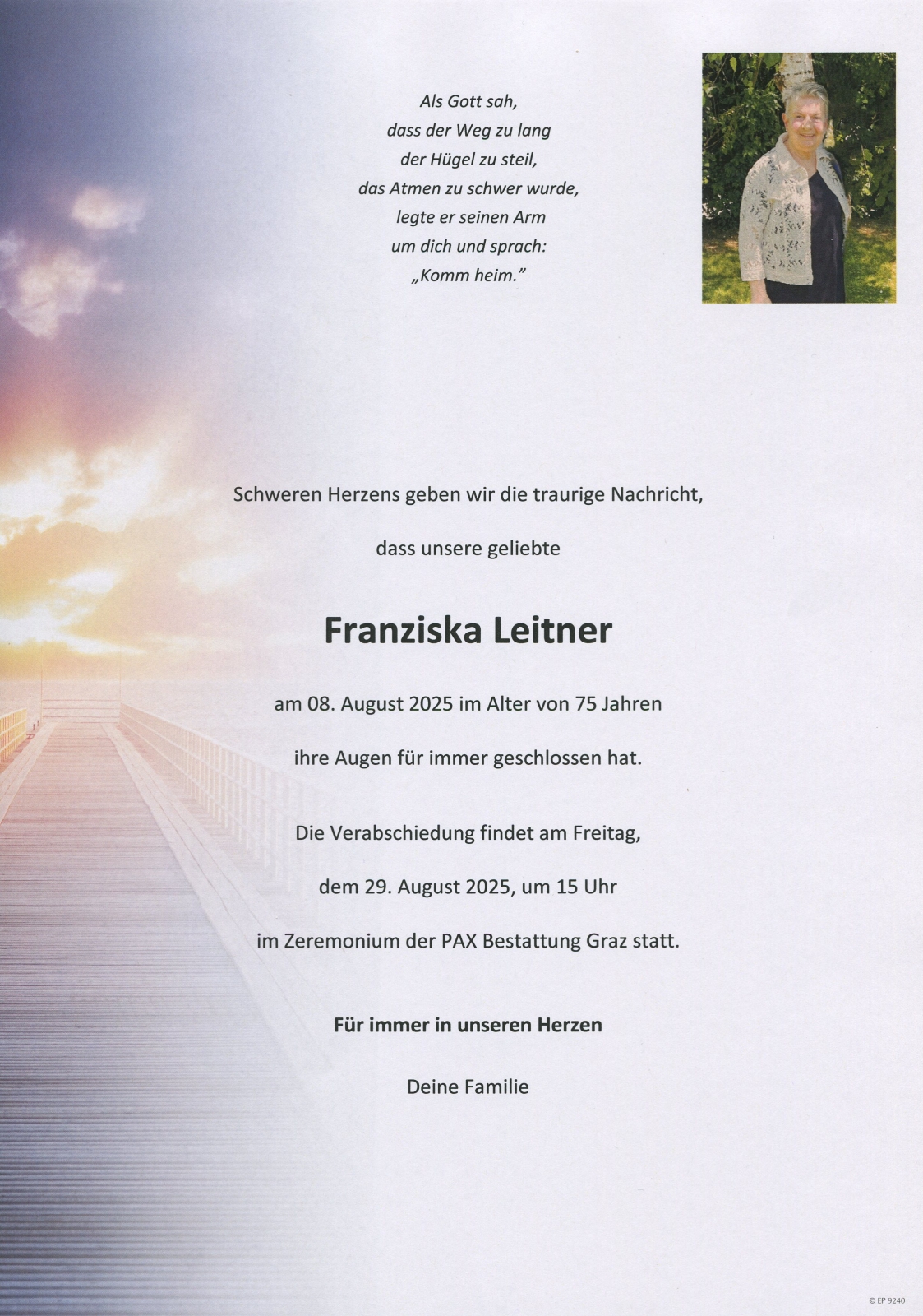 Verschicken Sie eine private Nachricht an die Familie & Hinterbliebenen von Franziska Leitner. Diese wird nicht veröffentlicht, sondern landet direkt im E-Mail-Postfach der Administrator:innen dieser persönlichen Gedenkseite.