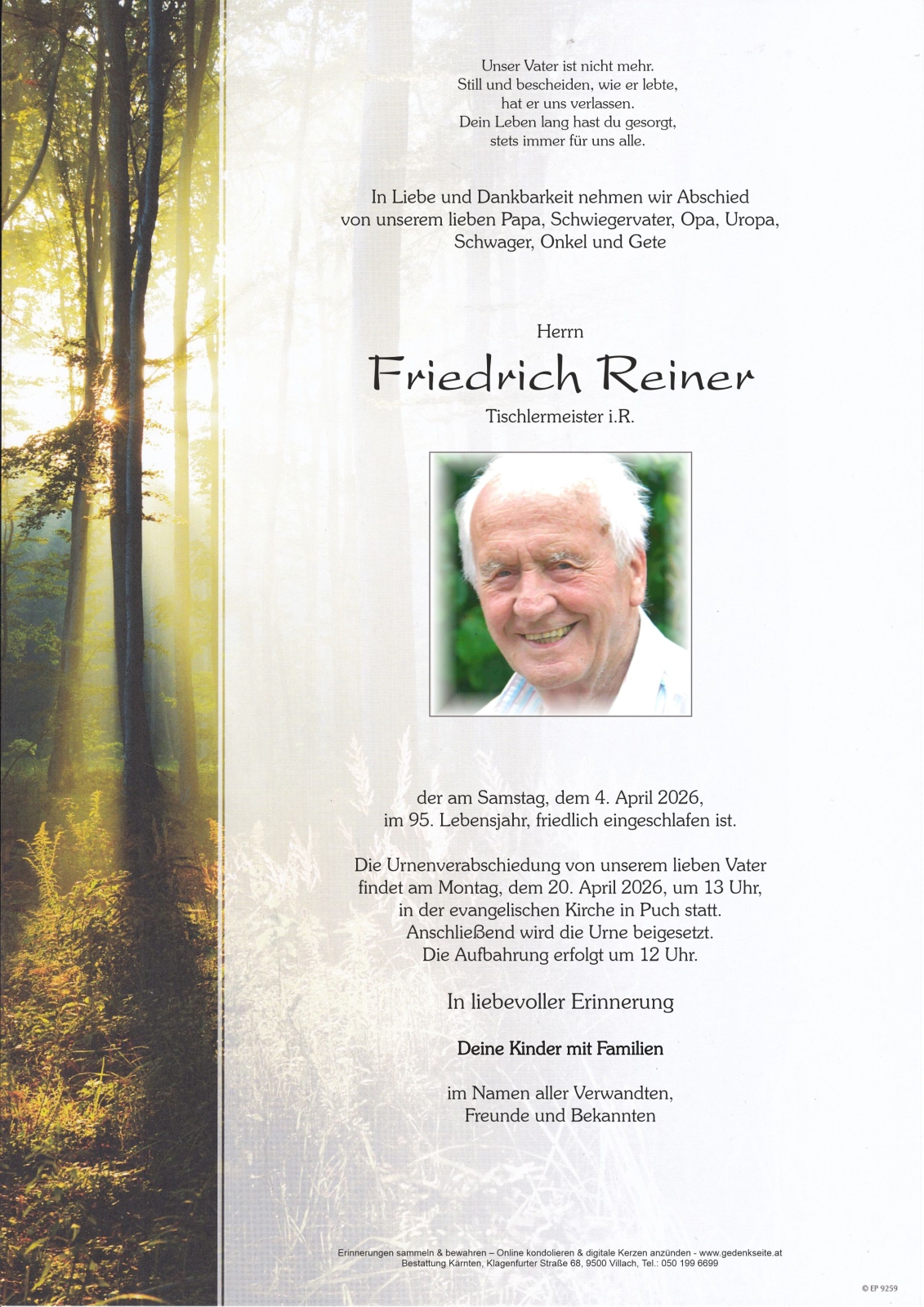 Trauerfeier am 20. April 2026 um 13:00 Uhr,