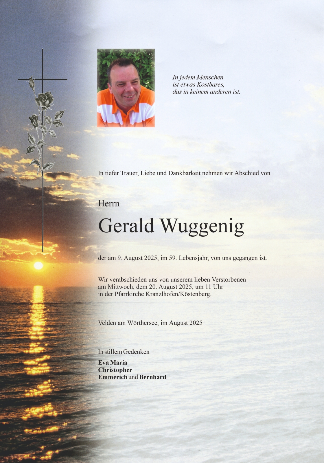 Verschicken Sie eine private Nachricht an die Familie & Hinterbliebenen von Gerald Wuggenig. Diese wird nicht veröffentlicht, sondern landet direkt im E-Mail-Postfach der Administrator:innen dieser persönlichen Gedenkseite.