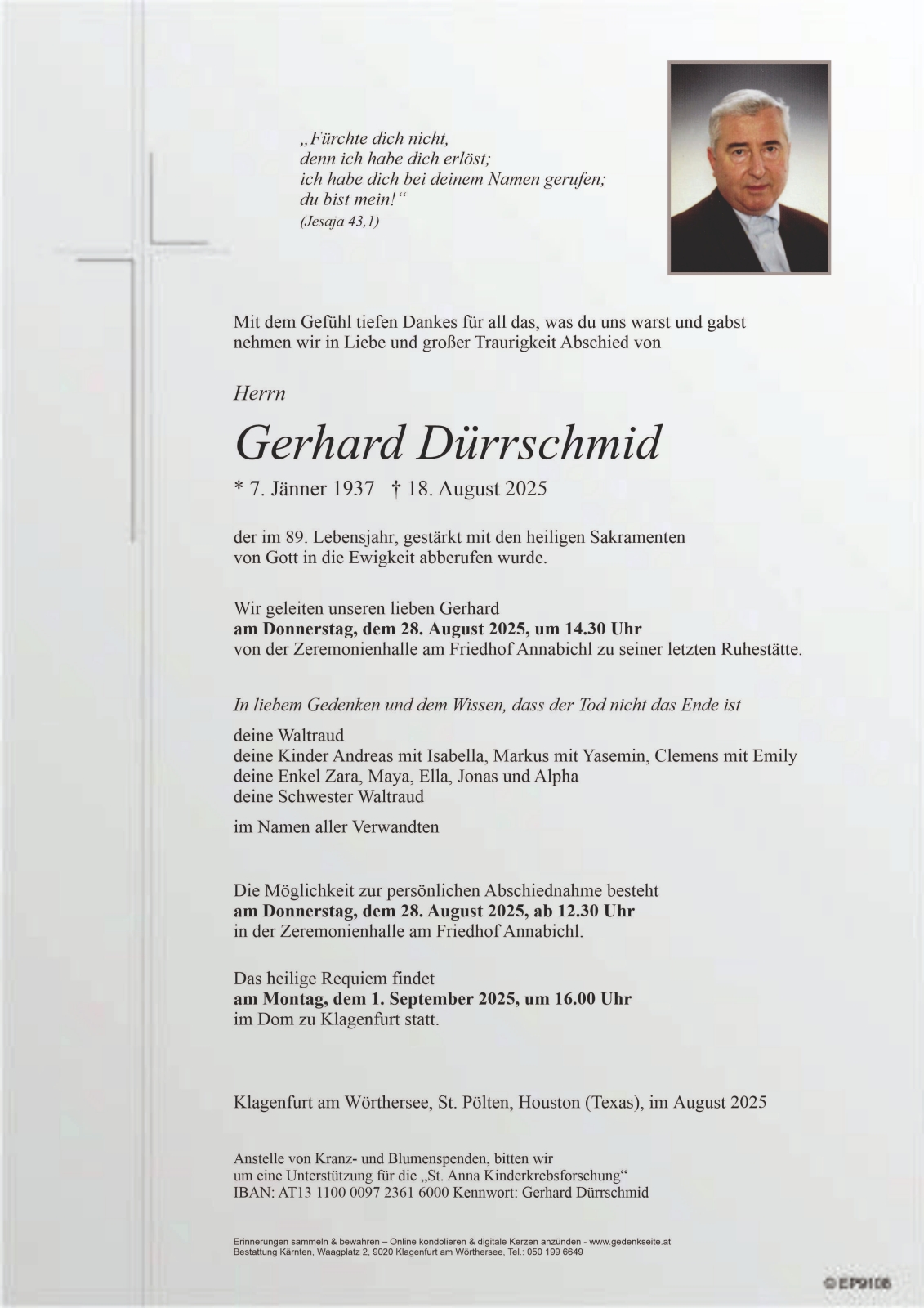 Verschicken Sie eine private Nachricht an die Familie & Hinterbliebenen von Gerhard Dürrschmid. Diese wird nicht veröffentlicht, sondern landet direkt im E-Mail-Postfach der Administrator:innen dieser persönlichen Gedenkseite.