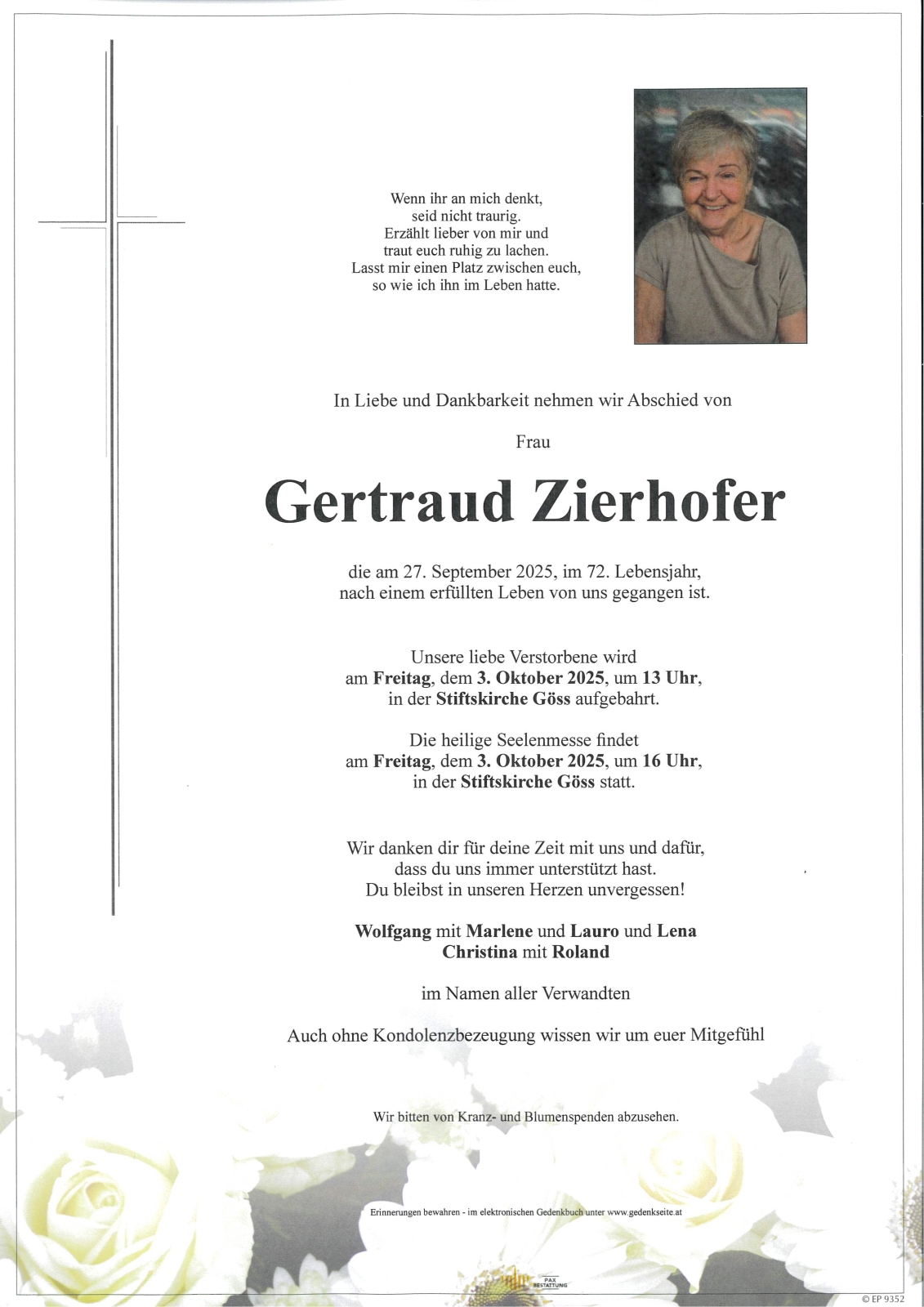 Verschicken Sie eine private Nachricht an die Familie & Hinterbliebenen von Gertraud Zierhofer. Diese wird nicht veröffentlicht, sondern landet direkt im E-Mail-Postfach der Administrator:innen dieser persönlichen Gedenkseite.