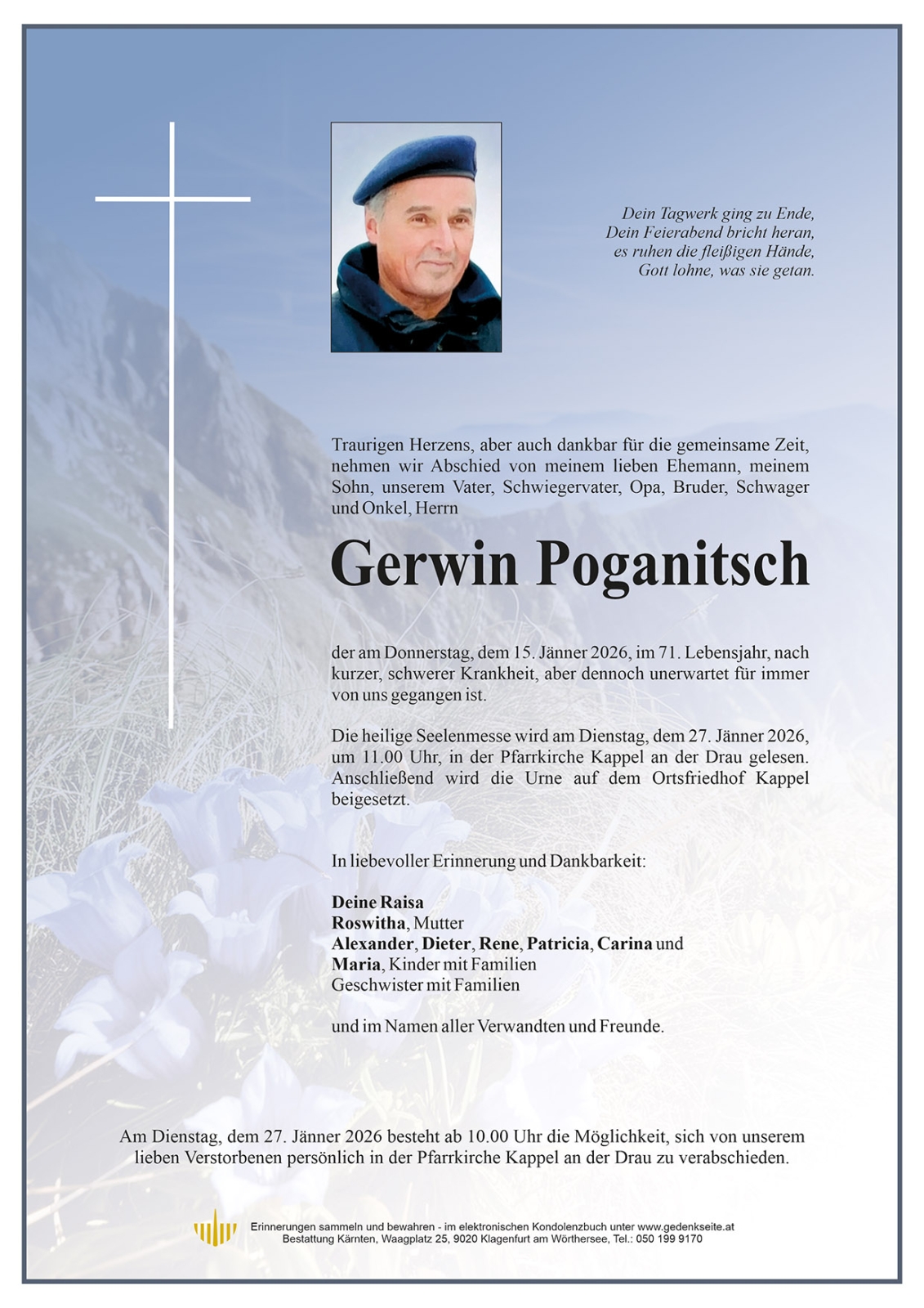 Trauerfeier am 27. Jänner 2026 um 11:00 Uhr,