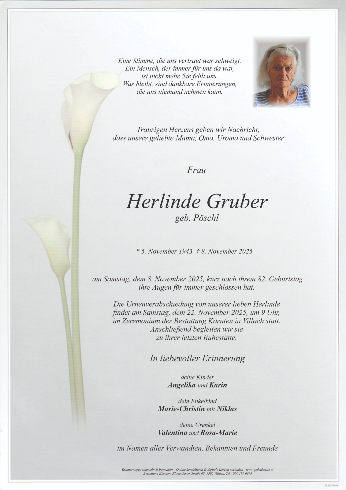 Verschicken Sie eine private Nachricht an die Familie & Hinterbliebenen von Gruber Herlinde. Diese wird nicht veröffentlicht, sondern landet direkt im E-Mail-Postfach der Administrator:innen dieser persönlichen Gedenkseite.
