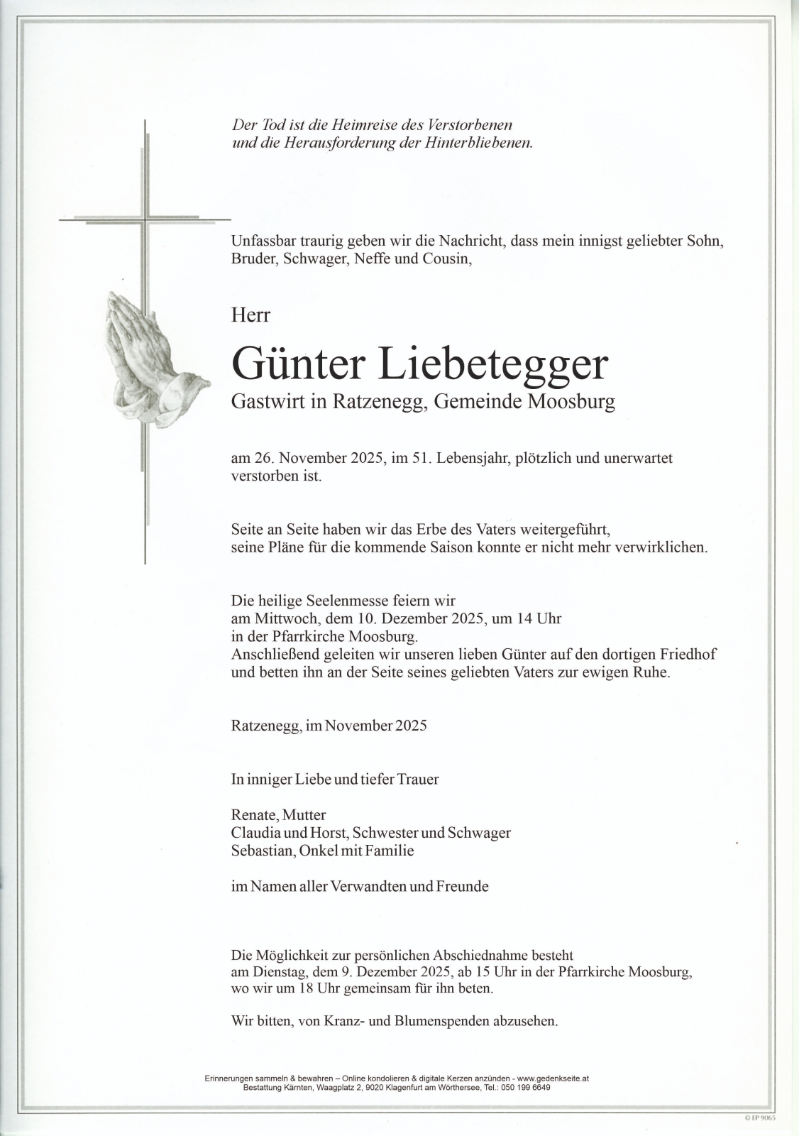 Verschicken Sie eine private Nachricht an die Familie & Hinterbliebenen von Günter Liebetegger. Diese wird nicht veröffentlicht, sondern landet direkt im E-Mail-Postfach der Administrator:innen dieser persönlichen Gedenkseite.