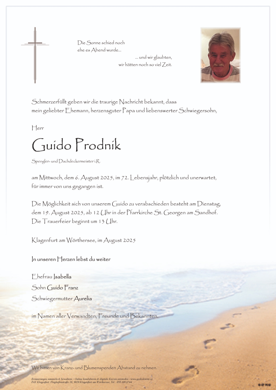 Verschicken Sie eine private Nachricht an die Familie & Hinterbliebenen von Guido Prodnik. Diese wird nicht veröffentlicht, sondern landet direkt im E-Mail-Postfach der Administrator:innen dieser persönlichen Gedenkseite.