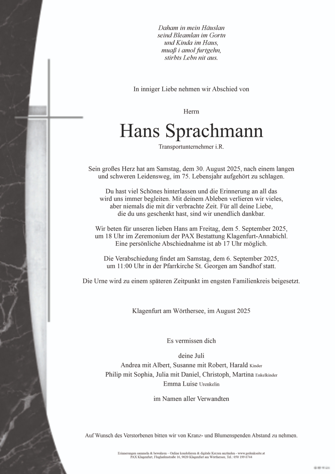 Trauerfeier am 6. September 2025 um 11:00 Uhr,