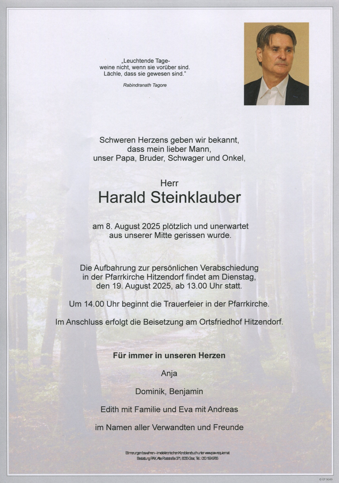 Verschicken Sie eine private Nachricht an die Familie & Hinterbliebenen von Harald Steinklauber. Diese wird nicht veröffentlicht, sondern landet direkt im E-Mail-Postfach der Administrator:innen dieser persönlichen Gedenkseite.