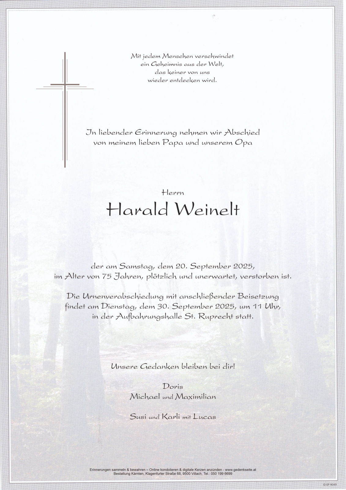 Verschicken Sie eine private Nachricht an die Familie & Hinterbliebenen von Harald Weinelt. Diese wird nicht veröffentlicht, sondern landet direkt im E-Mail-Postfach der Administrator:innen dieser persönlichen Gedenkseite.