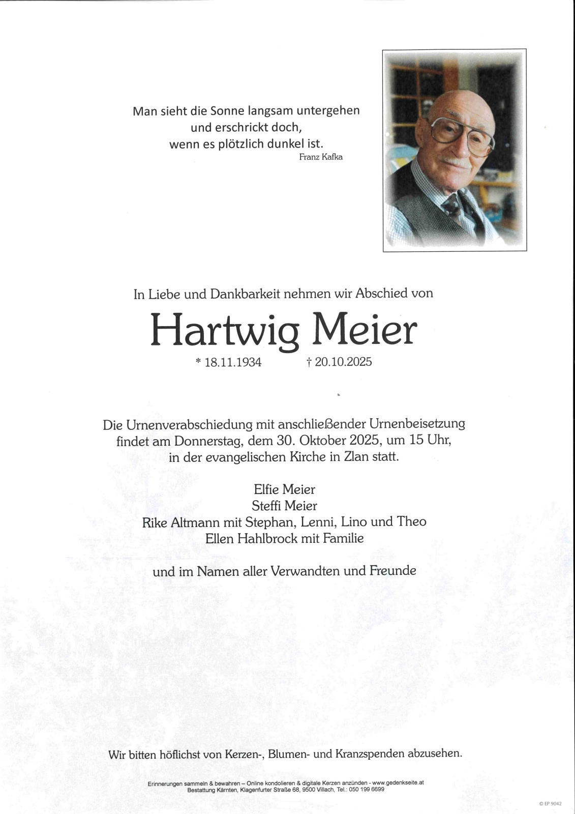 Verschicken Sie eine private Nachricht an die Familie & Hinterbliebenen von Hartwig Meier. Diese wird nicht veröffentlicht, sondern landet direkt im E-Mail-Postfach der Administrator:innen dieser persönlichen Gedenkseite.