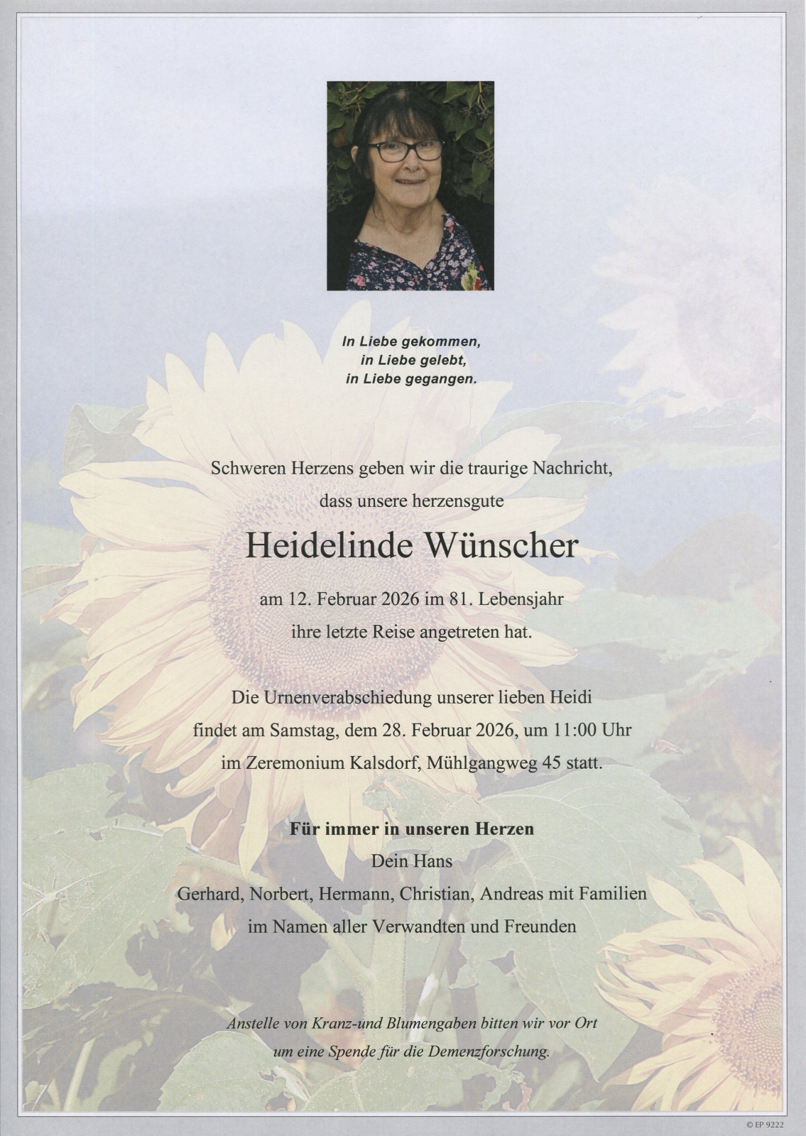 Verschicken Sie eine private Nachricht an die Familie & Hinterbliebenen von Heidelinde Wünscher. Diese wird nicht veröffentlicht, sondern landet direkt im E-Mail-Postfach der Administrator:innen dieser persönlichen Gedenkseite.