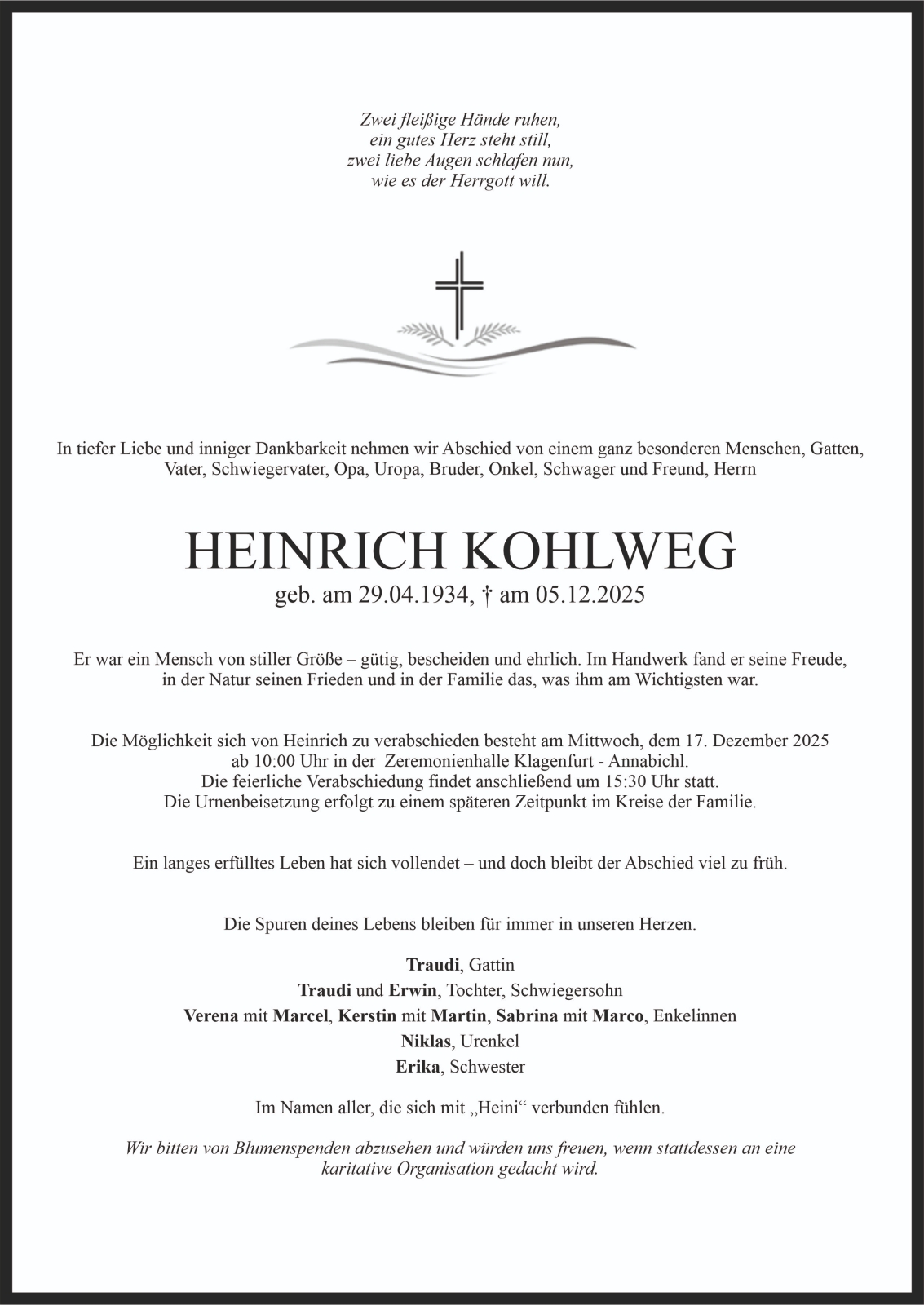 Trauerfeier am 17. Dezember 2025 um 15:30 Uhr,