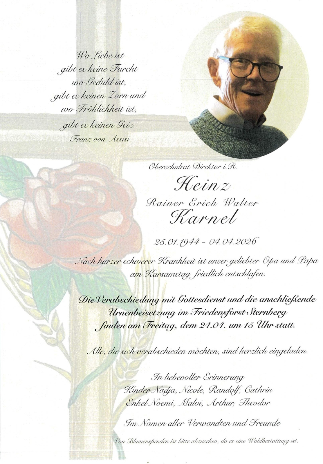 Verschicken Sie eine private Nachricht an die Familie & Hinterbliebenen von Heinz Karnel. Diese wird nicht veröffentlicht, sondern landet direkt im E-Mail-Postfach der Administrator:innen dieser persönlichen Gedenkseite.