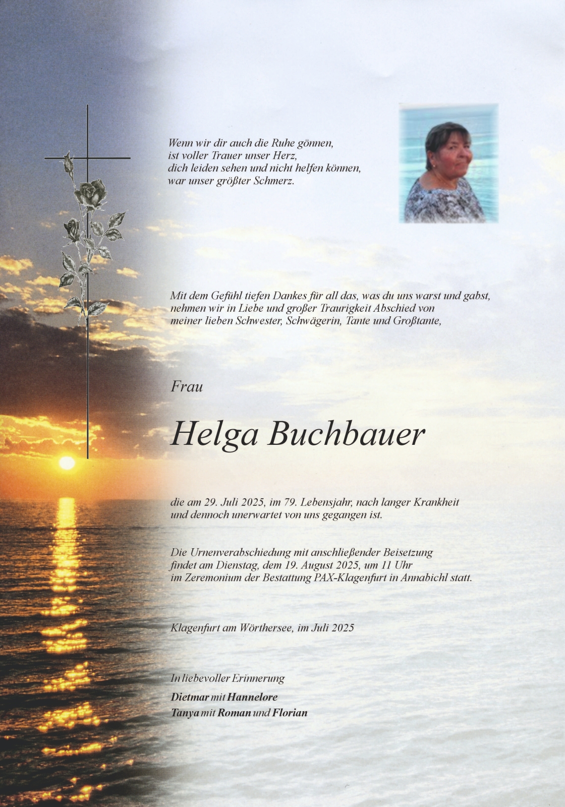 Verschicken Sie eine private Nachricht an die Familie & Hinterbliebenen von Helga Buchbauer. Diese wird nicht veröffentlicht, sondern landet direkt im E-Mail-Postfach der Administrator:innen dieser persönlichen Gedenkseite.