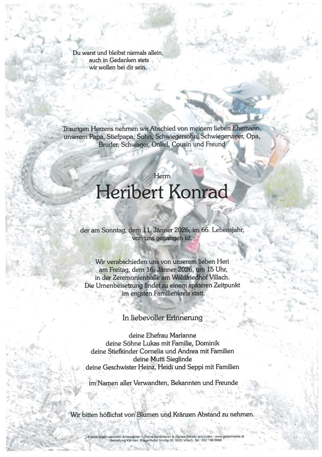 Verschicken Sie eine private Nachricht an die Familie & Hinterbliebenen von Heribert Konrad. Diese wird nicht veröffentlicht, sondern landet direkt im E-Mail-Postfach der Administrator:innen dieser persönlichen Gedenkseite.