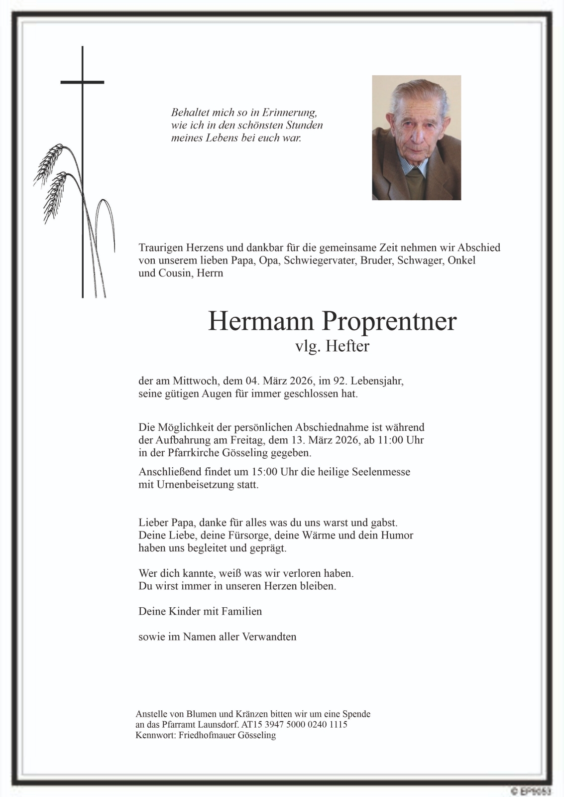 Verschicken Sie eine private Nachricht an die Familie & Hinterbliebenen von Hermann Proprentner. Diese wird nicht veröffentlicht, sondern landet direkt im E-Mail-Postfach der Administrator:innen dieser persönlichen Gedenkseite.