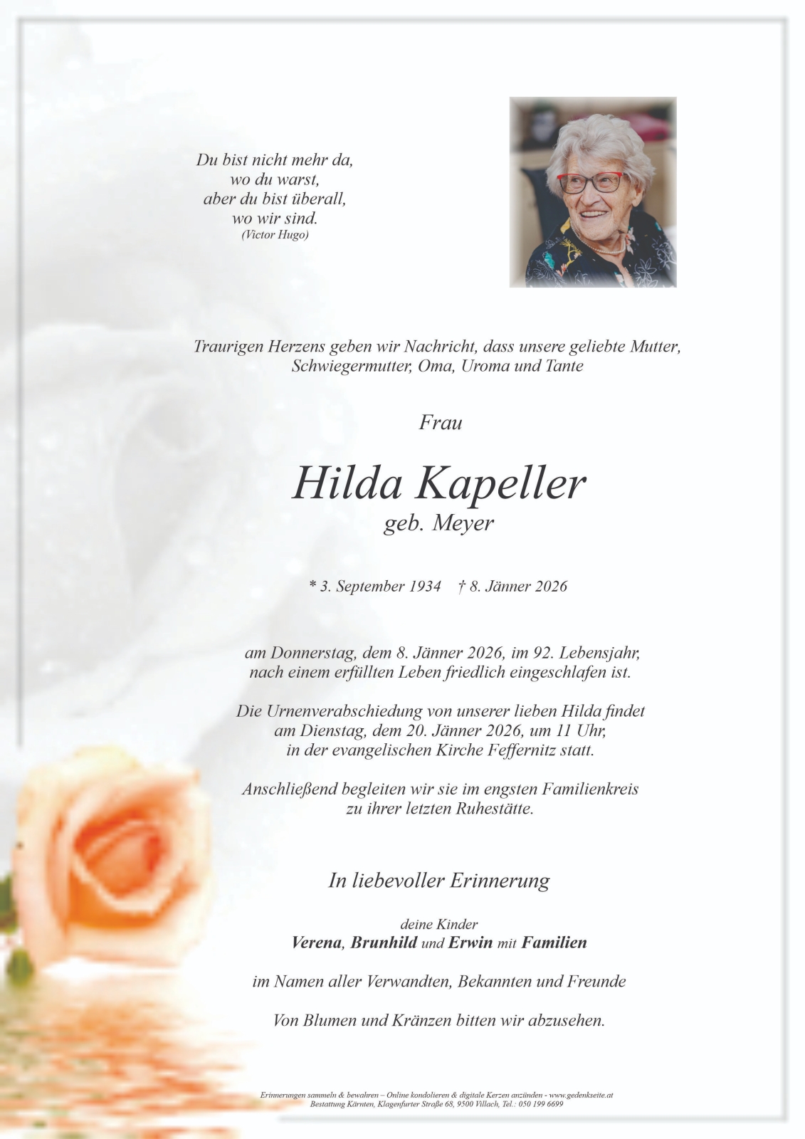 Verschicken Sie eine private Nachricht an die Familie & Hinterbliebenen von Hilda Kapeller. Diese wird nicht veröffentlicht, sondern landet direkt im E-Mail-Postfach der Administrator:innen dieser persönlichen Gedenkseite.