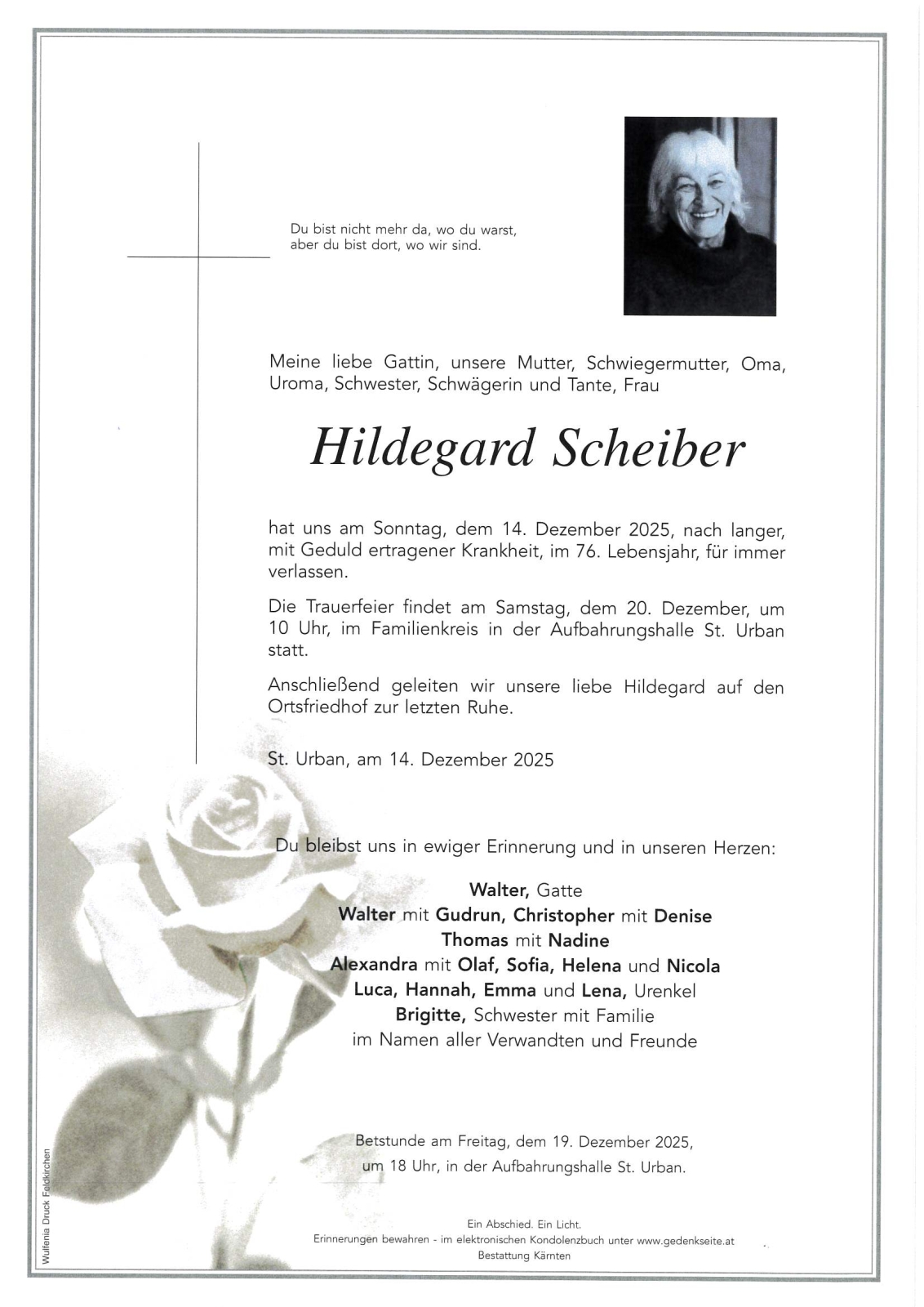 Verschicken Sie eine private Nachricht an die Familie & Hinterbliebenen von Hildegard Scheiber. Diese wird nicht veröffentlicht, sondern landet direkt im E-Mail-Postfach der Administrator:innen dieser persönlichen Gedenkseite.