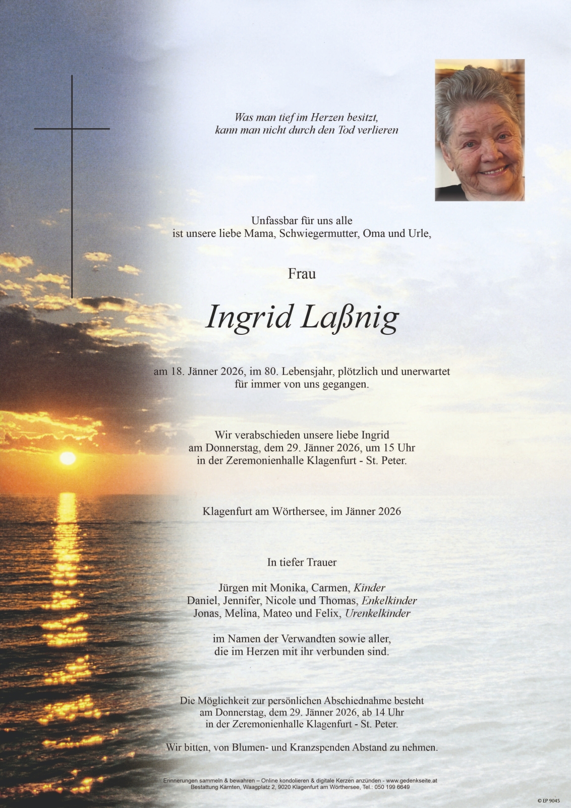 Trauerfeier am 29. Jänner 2026 um 15:00 Uhr,