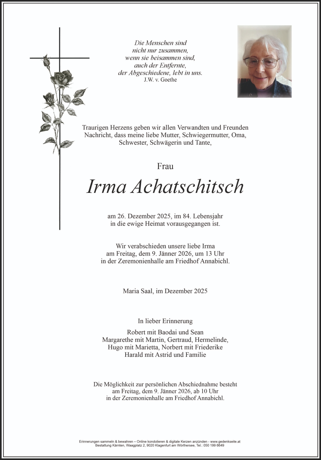 Verschicken Sie eine private Nachricht an die Familie & Hinterbliebenen von Irma Achatschitsch. Diese wird nicht veröffentlicht, sondern landet direkt im E-Mail-Postfach der Administrator:innen dieser persönlichen Gedenkseite.