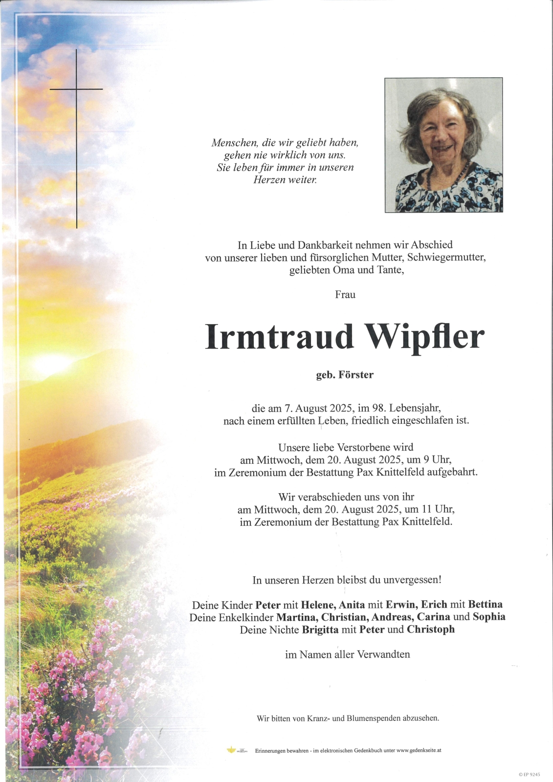 Verschicken Sie eine private Nachricht an die Familie & Hinterbliebenen von Irmtraud Wipfler. Diese wird nicht veröffentlicht, sondern landet direkt im E-Mail-Postfach der Administrator:innen dieser persönlichen Gedenkseite.