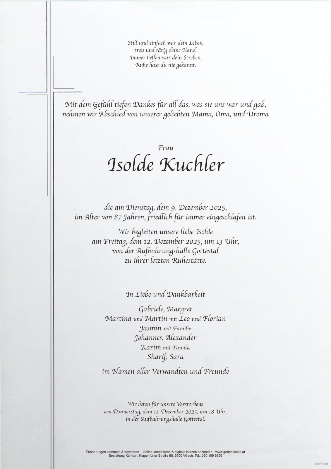 Trauerfeier am 11. Dezember 2025 um 15:00 Uhr,