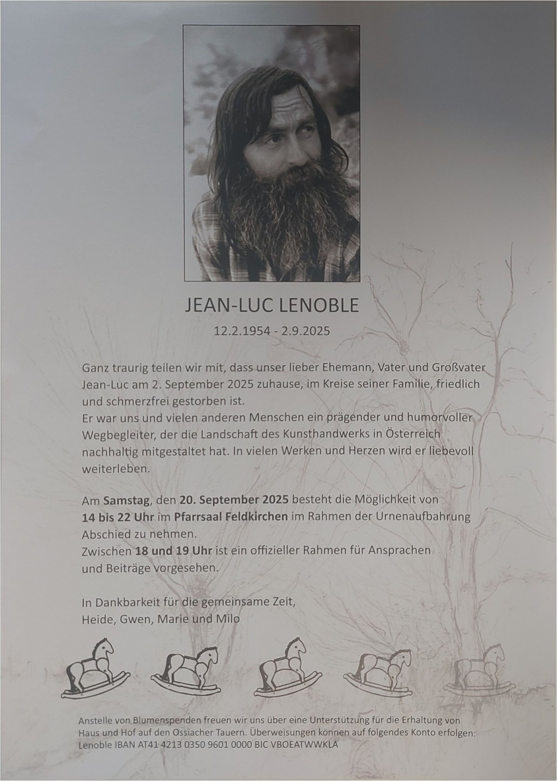 Verschicken Sie eine private Nachricht an die Familie & Hinterbliebenen von Jean-luc Lenoble. Diese wird nicht veröffentlicht, sondern landet direkt im E-Mail-Postfach der Administrator:innen dieser persönlichen Gedenkseite.